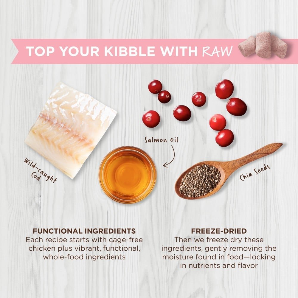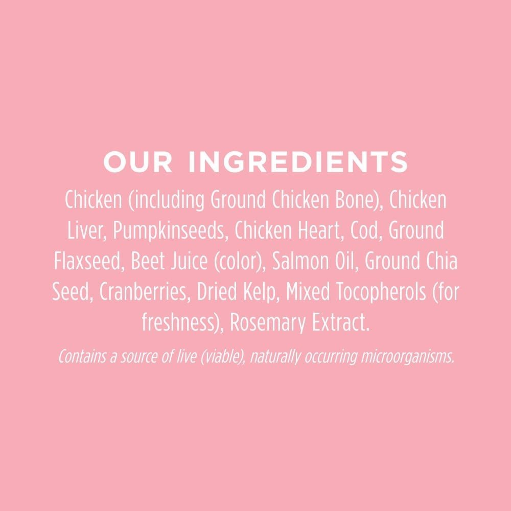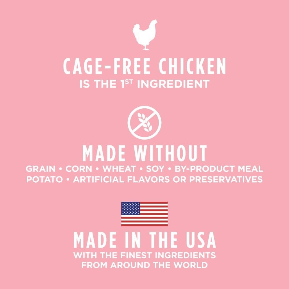 - Made with cage-free chicken plus vibrant, functional whole-food ingredients like wild-caught cod, salmon oil, chia seeds and cranberries